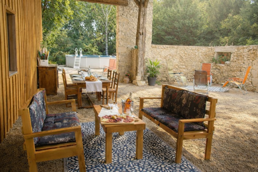 La terrasse couverte permet de profiter des repas et/ou apéritifs en plein air à l’abri du soleil ou de la pluie
